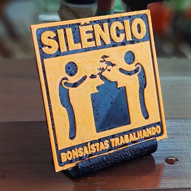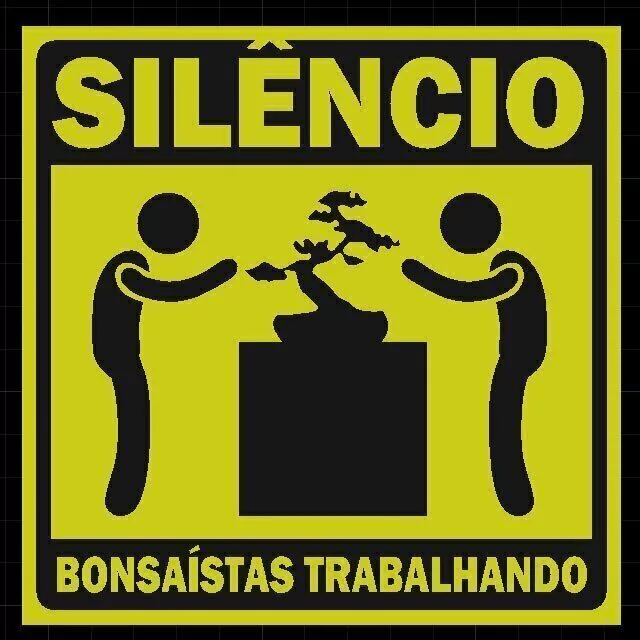 Nada melhor do que juntar os amigos para ajudar no refino de seu bonsai, mas é preciso foco e atenção no trabalho então a placa "SILÊNCIO BONSAÍSTAS TRABALHANDO" é ideal para manter a tranquilidade no recinto. Você vai se sentir trabalhando num templo budista de tão calmo vai ficar.